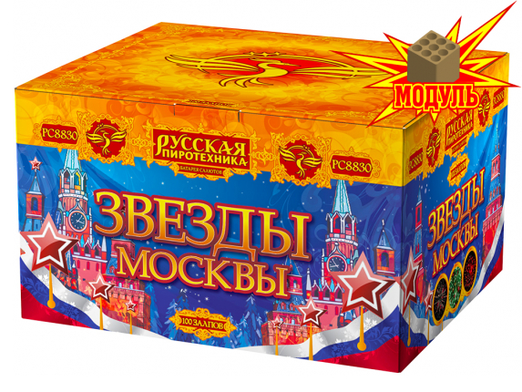 Фейерверк Звезды Москвы – это еще одна восхитительная батарея салютов из каталога пиротехники магазина TorgSalut. Красочная картина фейерверка вам гарантирована – количество залпов 100 салюта Звезды Москвы говорит о многом. Перед тем как купить фейерверк, можете посмотреть фото и видео салюта РС883-М Звезды Москвы. Со списком уникальных пиротехнических эффектов фейерверка вы можете ознакомиться по вкладке ДОПОЛНИТЕЛЬНО.